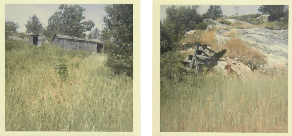 Had a little lunch and Liz, Nick, Suzie and I went back to the lake to see what we could catch. Nick caught a little catch. Headed back for the boat but Liz and I decided to take a side road up to a deserted house. It was an old tree house, an old wagon, sled, plow and logging sled. Walked past and on up the road and we found an old barn where they must have repaired the equipment because we found a bench and a lot of screw. Headed up to the road and we found the old dam with a couple of waterfalls. Decided to walk across and see what was on the other side. Climbed up the hill and the lake goes way back and there is a stream or river off a bay a good ways back. Came back across the falls again and back down to the main road. Decided to see where it went. Walked a good half a mile and all we saw was rubbish piles in a family of chipmunks. Came back to the boat just in time for steak dinner.