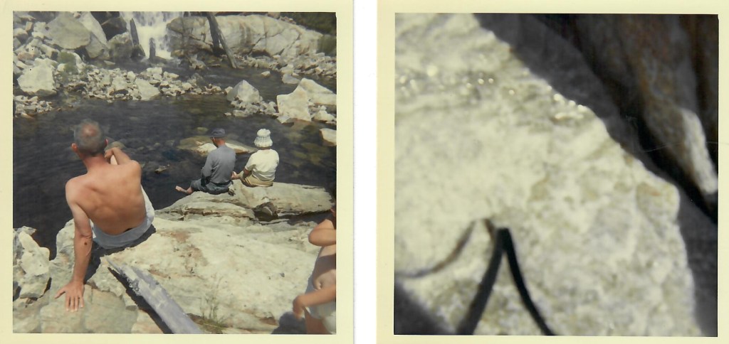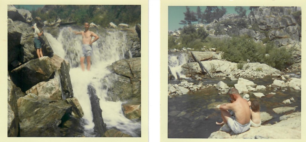 Woke up this morning to a bright blue sky, and our friend, the wind. Still blowing. Had breakfast and decided to take everyone back to see the waterfalls. Sun terrifically hot. Tramped all over the falls and took a lot of pictures. Was very hot so I decided to take a shower. What a refreshing feeling. Everyone decided to get into the act so we all had a good bath. Too bad someone didn’t think to bring the soap. Scoured the rocks for stones with garnet or silver in them. Found a huge boulder with quite a silver vein running through it. Liz spent the better part of an hour trying to chip out a piece. (And gashed her wrist, leaving a scar she had her entire life.) Did pick up some beauties though.